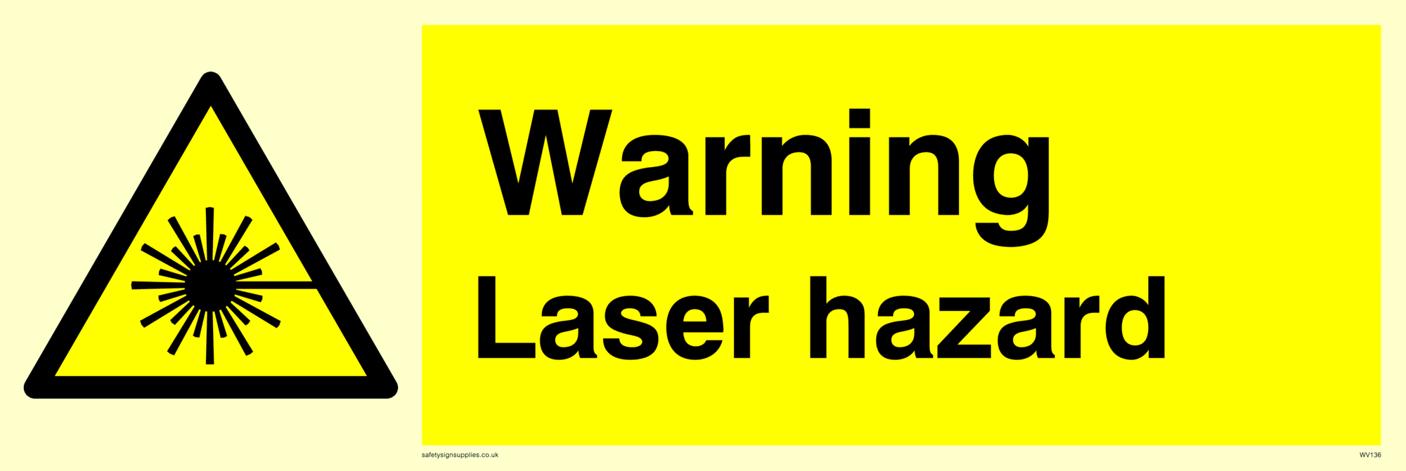 This sign contains an international standard laser warning symbol. Laser beam and star burst in black on yellow warning triangle with black border.