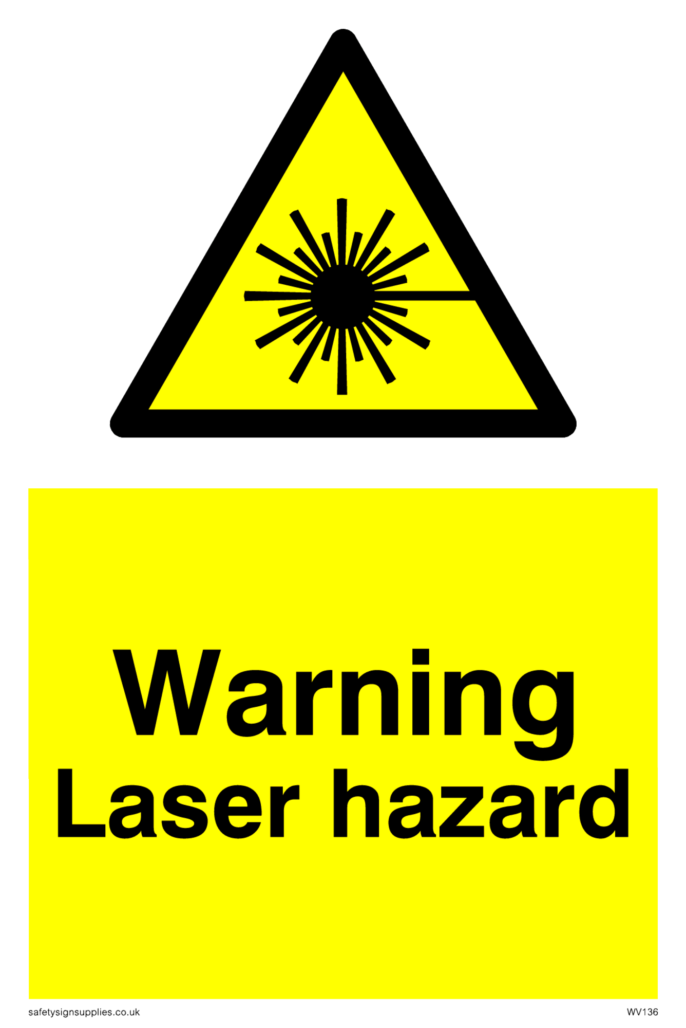 This sign contains an international standard laser warning symbol. Laser beam and star burst in black on yellow warning triangle with black border.