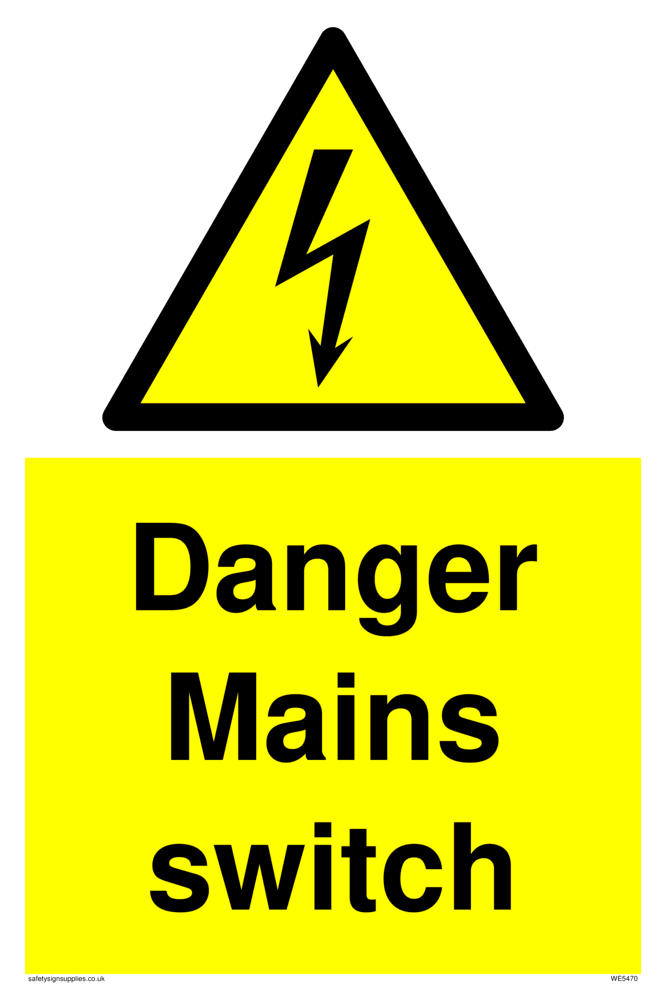 This sign contains an electrical warning symbol. Lightning flash in black on yellow warning triangle with black border.