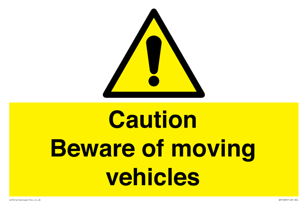 Caution Beware of moving vehicles with exclamation in warning triangle