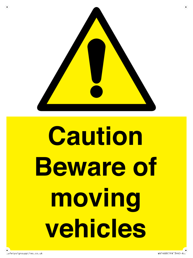 Caution Beware of moving vehicles with exclamation in warning triangle