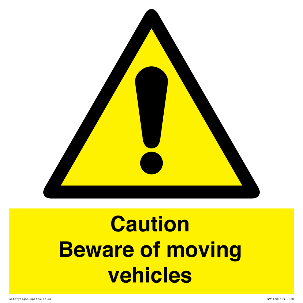 Caution Beware of moving vehicles with exclamation in warning triangle