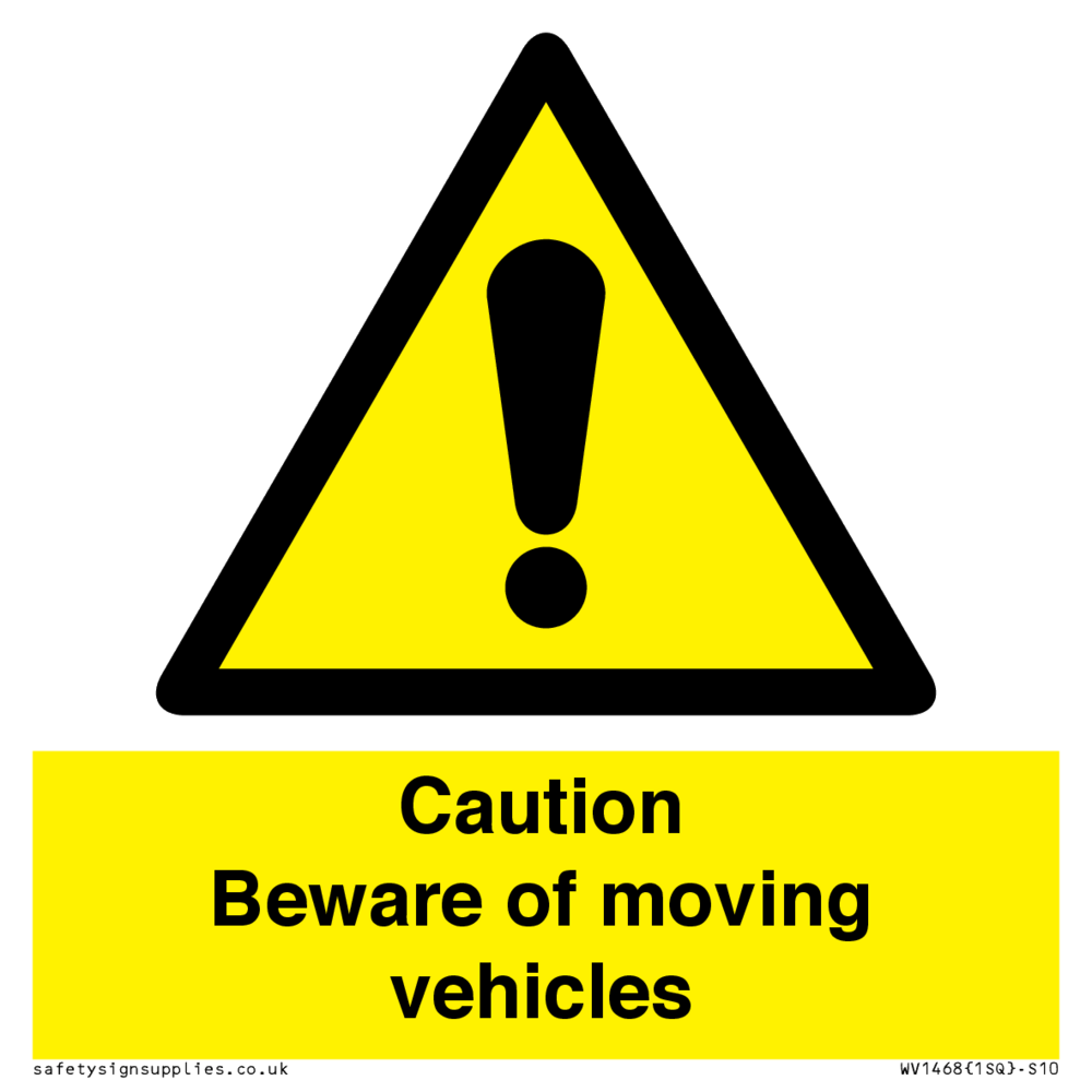 Caution Beware of moving vehicles with exclamation in warning triangle