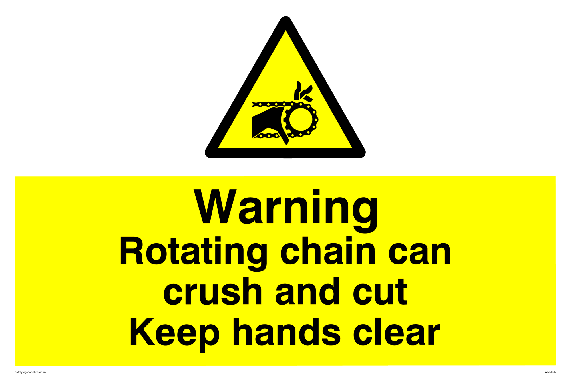 This sign contains a moving machinery / finger trap warning. Cogs with hand advancing towards pinch point in black on yellow warning triangle with black border.