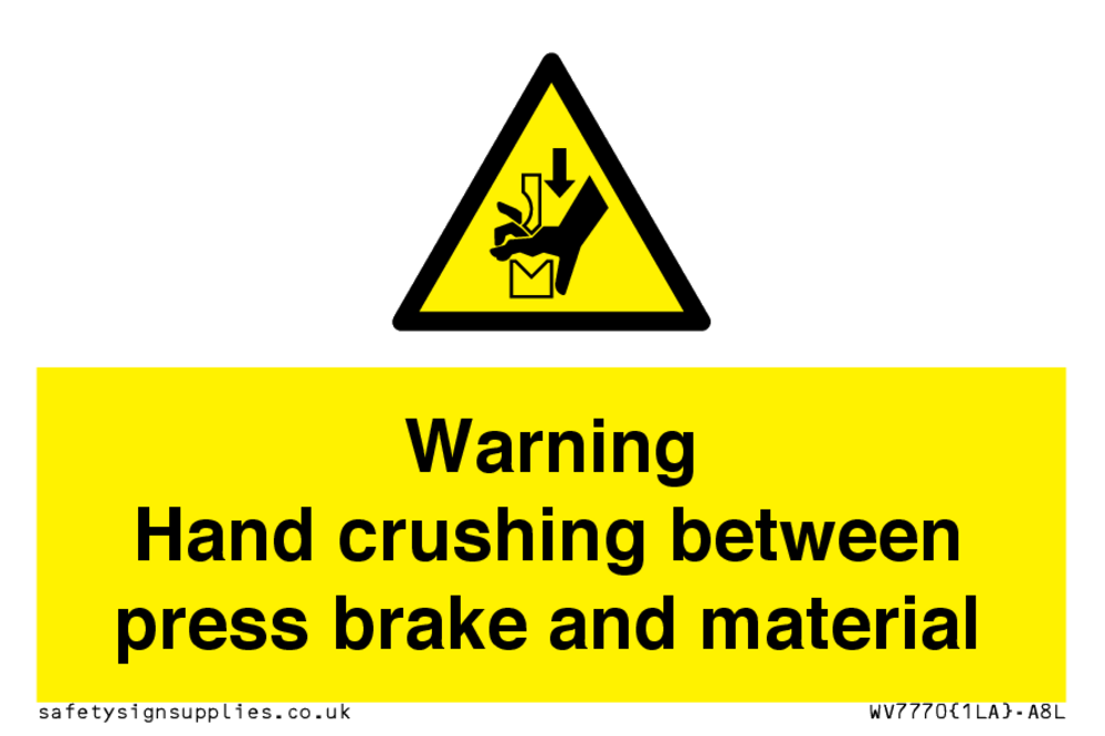 Sign Text: Warning Hand crushing between press brake and material