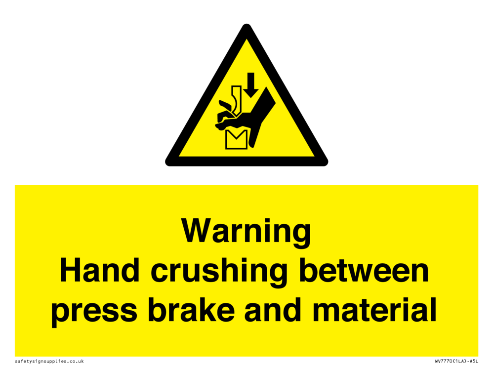 Sign Text: Warning Hand crushing between press brake and material