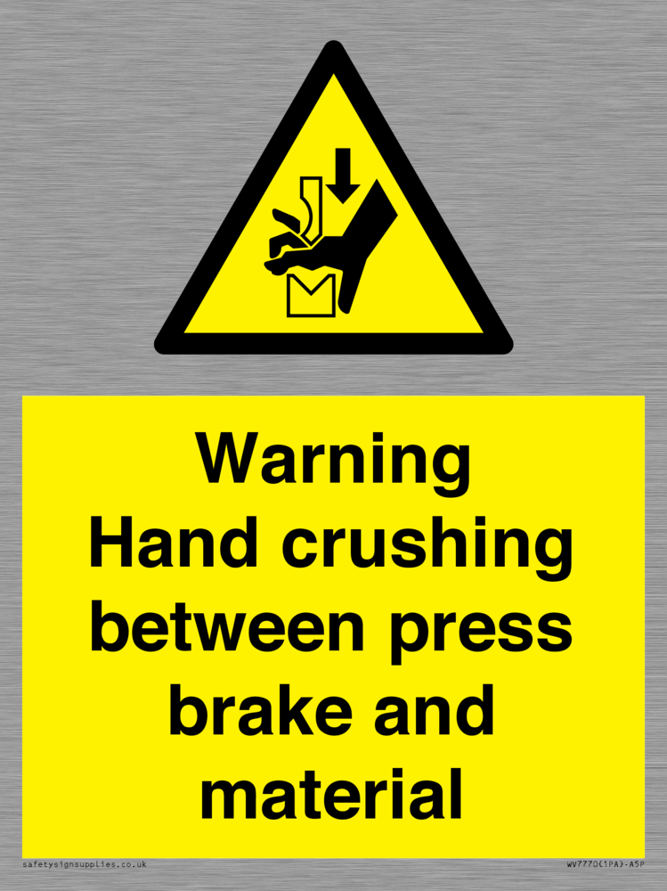 Sign Text: Warning Hand crushing between press brake and material