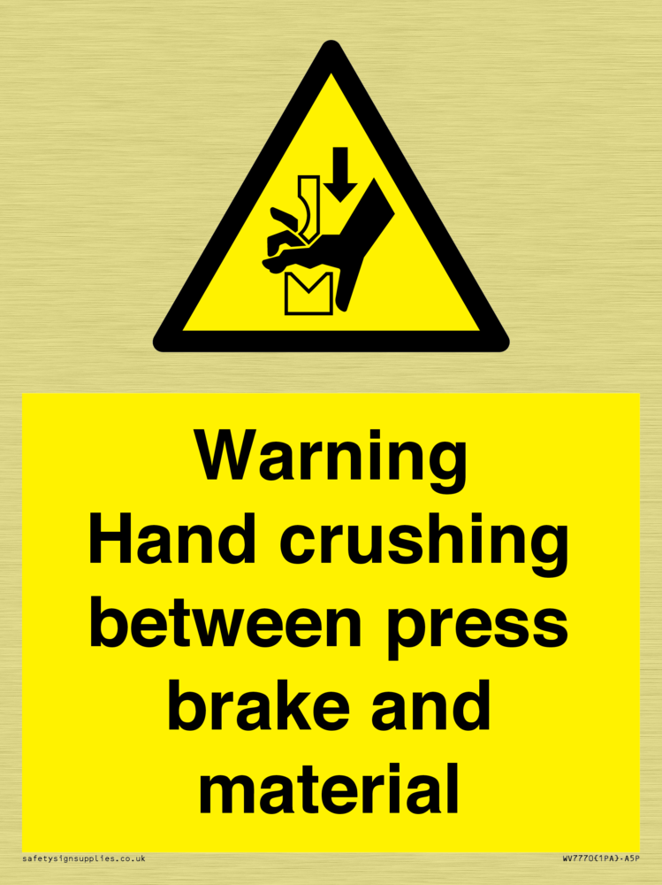 Sign Text: Warning Hand crushing between press brake and material