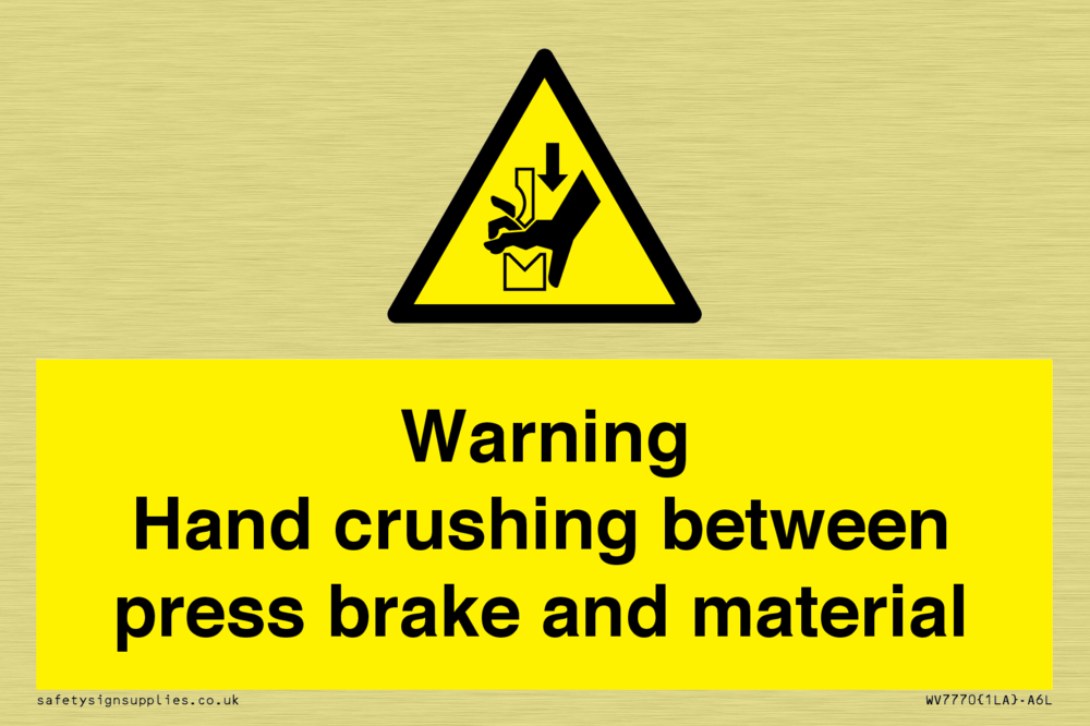 Sign Text: Warning Hand crushing between press brake and material