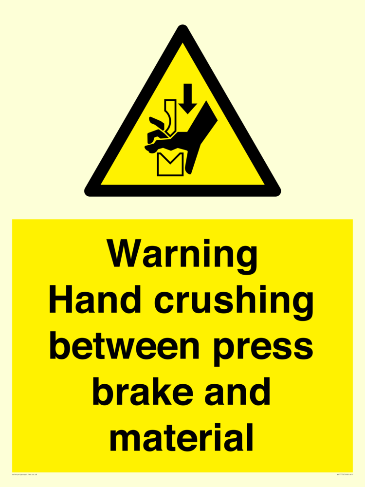 Sign Text: Warning Hand crushing between press brake and material