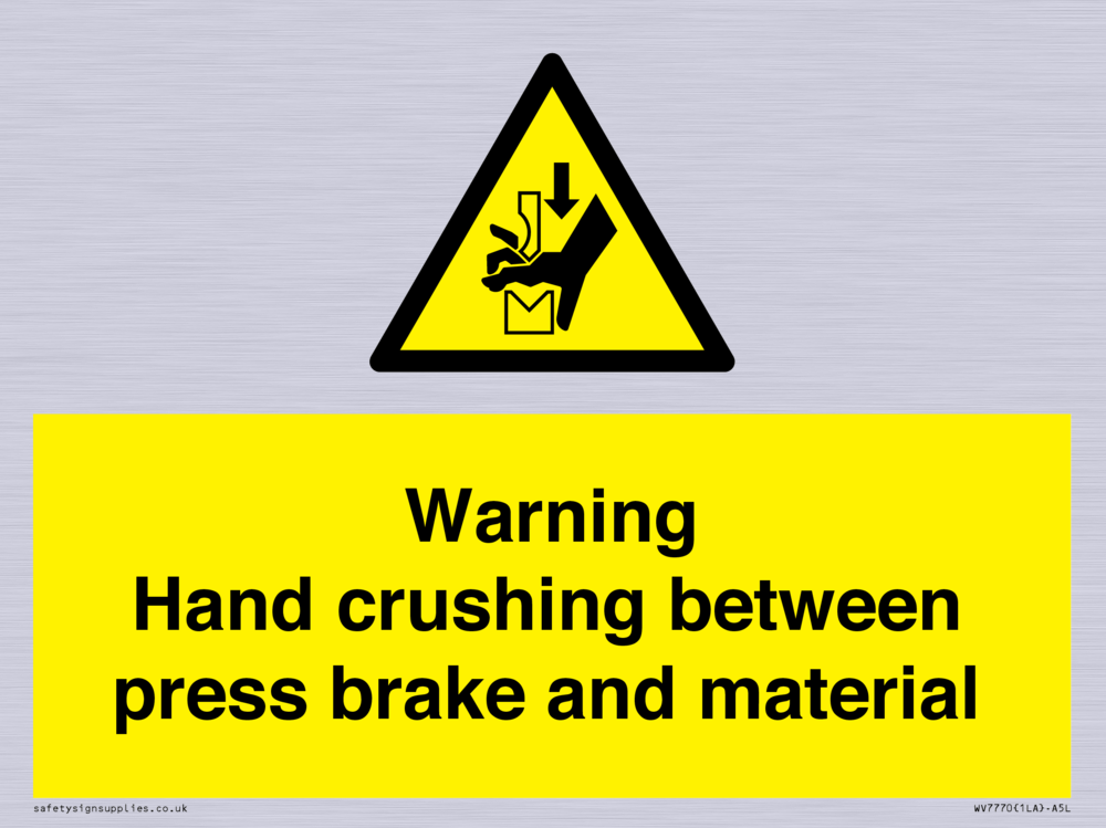 Sign Text: Warning Hand crushing between press brake and material