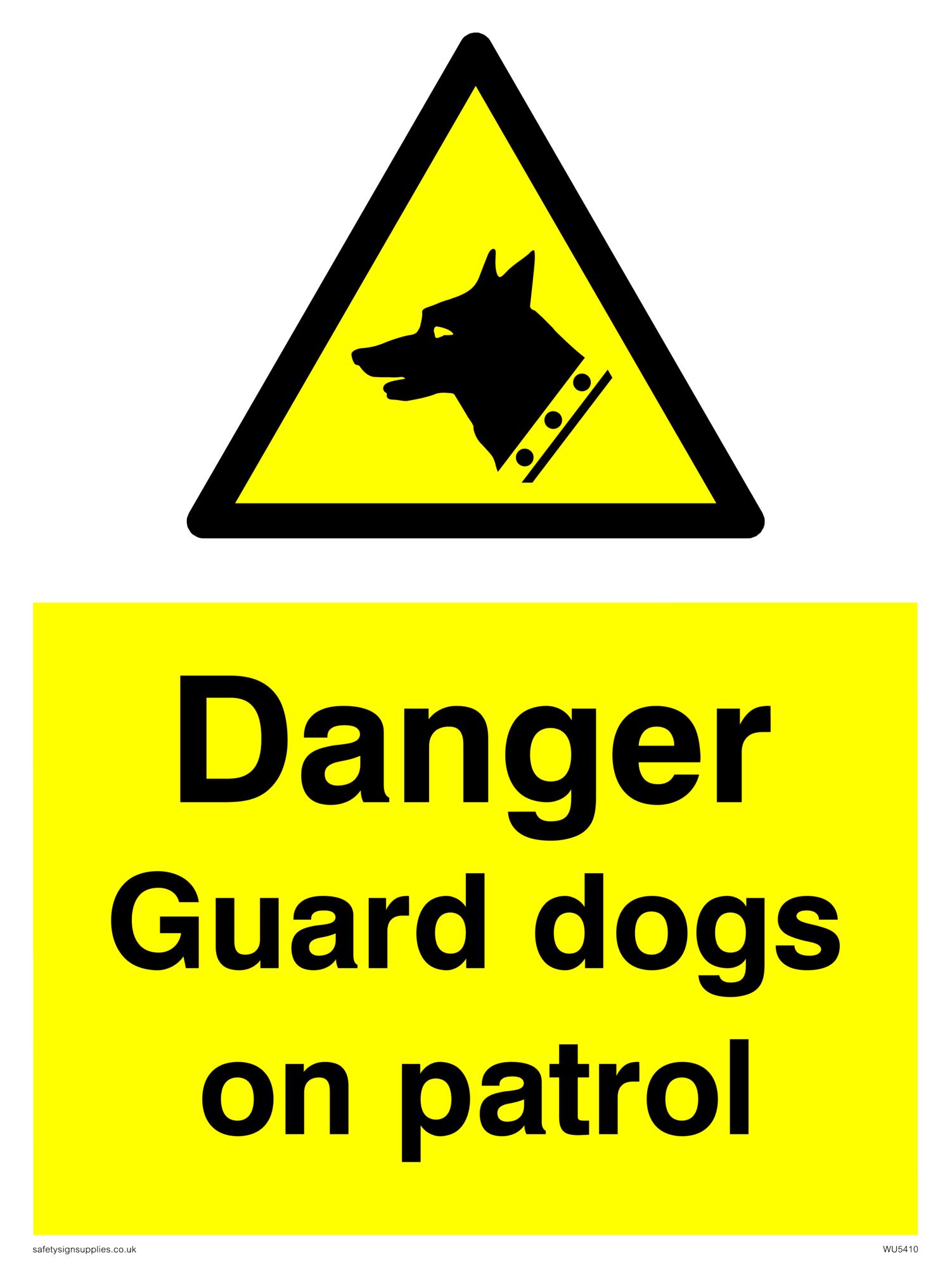 This sign contains a guard dog warning symbol. Guard dog in black on yellow warning triangle with black border.