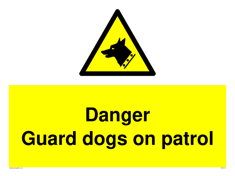 This sign contains a guard dog warning symbol. Guard dog in black on yellow warning triangle with black border.