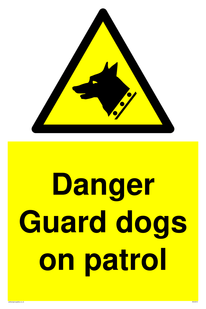 This sign contains a guard dog warning symbol. Guard dog in black on yellow warning triangle with black border.