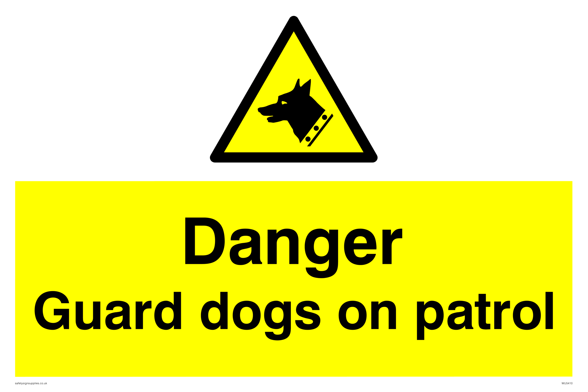 This sign contains a guard dog warning symbol. Guard dog in black on yellow warning triangle with black border.