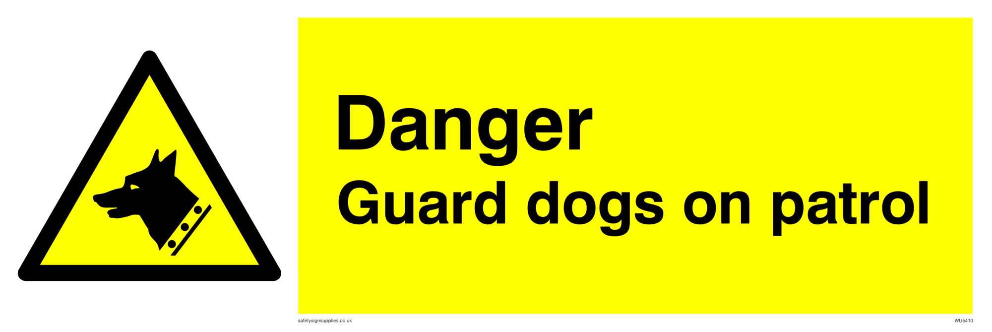 This sign contains a guard dog warning symbol. Guard dog in black on yellow warning triangle with black border.