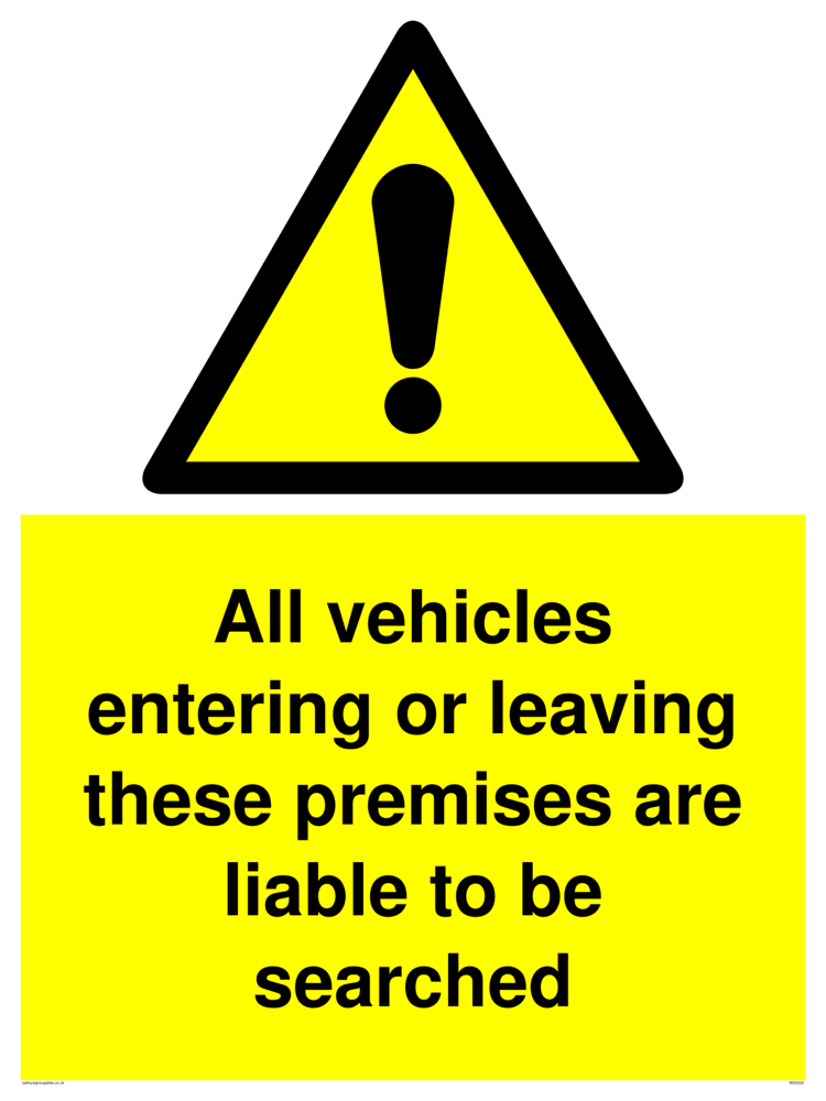 Sign Text: All vehicles entering or leaving these premises are liable to be searched