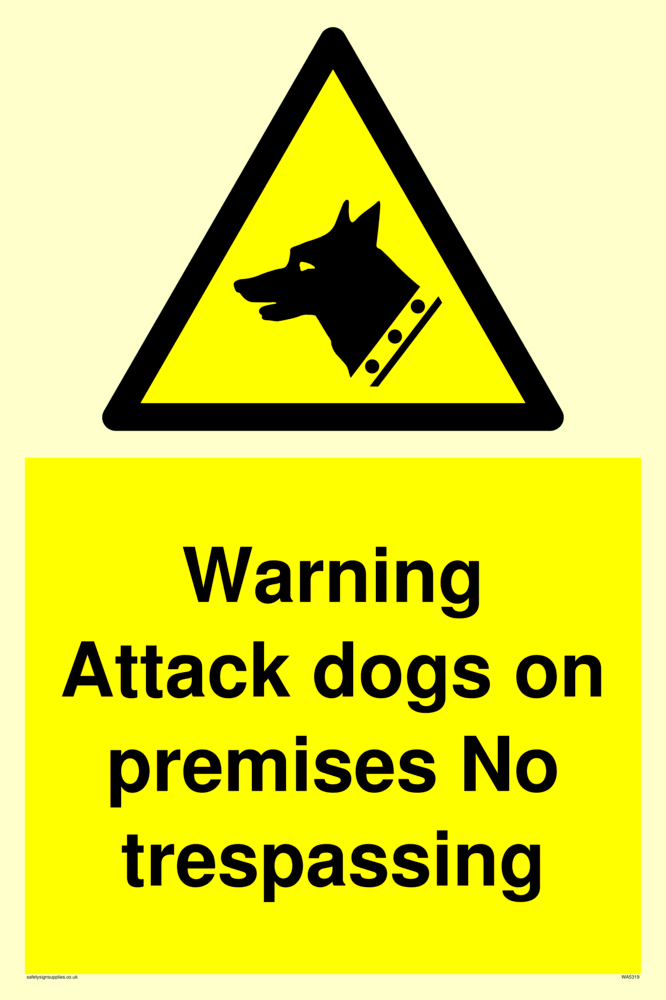 This sign contains a guard dog warning symbol. Guard dog in black on yellow warning triangle with black border.