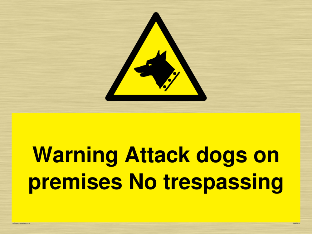 This sign contains a guard dog warning symbol. Guard dog in black on yellow warning triangle with black border.