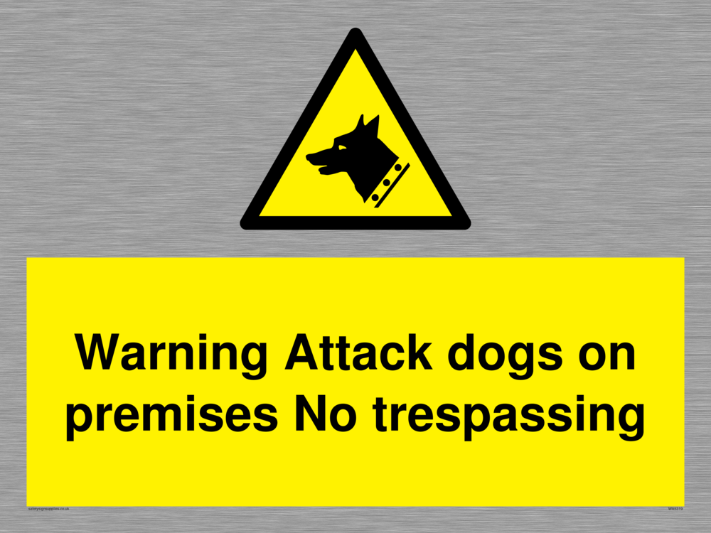 This sign contains a guard dog warning symbol. Guard dog in black on yellow warning triangle with black border.