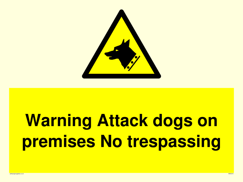 This sign contains a guard dog warning symbol. Guard dog in black on yellow warning triangle with black border.