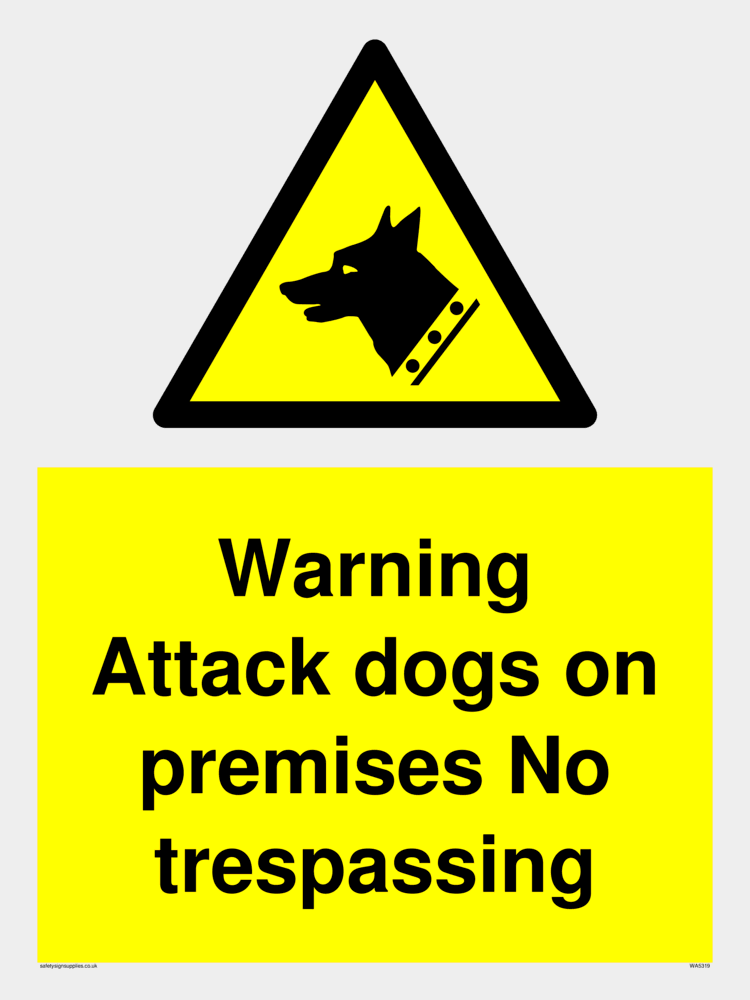 This sign contains a guard dog warning symbol. Guard dog in black on yellow warning triangle with black border.