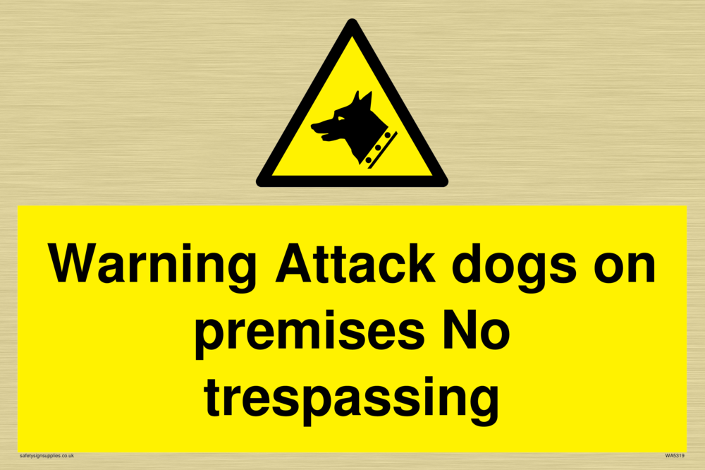 This sign contains a guard dog warning symbol. Guard dog in black on yellow warning triangle with black border.