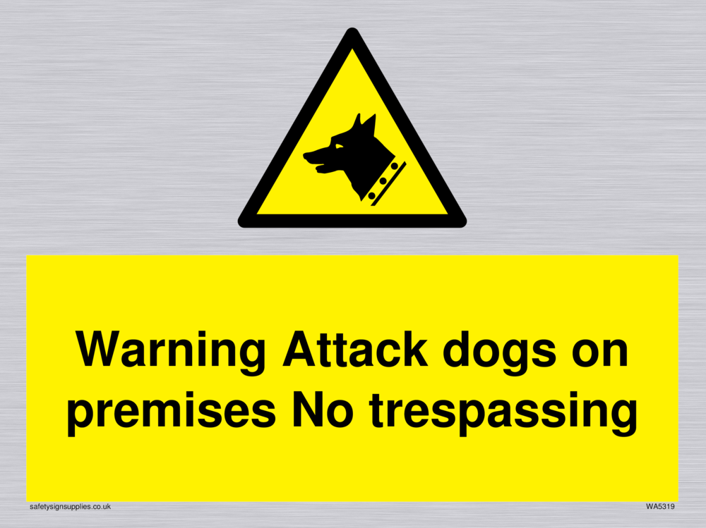 This sign contains a guard dog warning symbol. Guard dog in black on yellow warning triangle with black border.