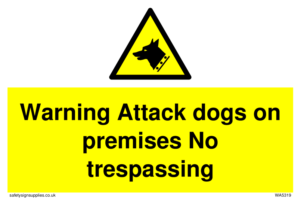 This sign contains a guard dog warning symbol. Guard dog in black on yellow warning triangle with black border.