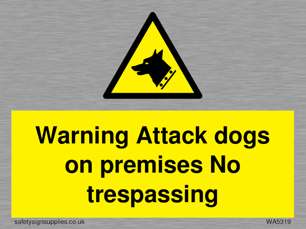 This sign contains a guard dog warning symbol. Guard dog in black on yellow warning triangle with black border.