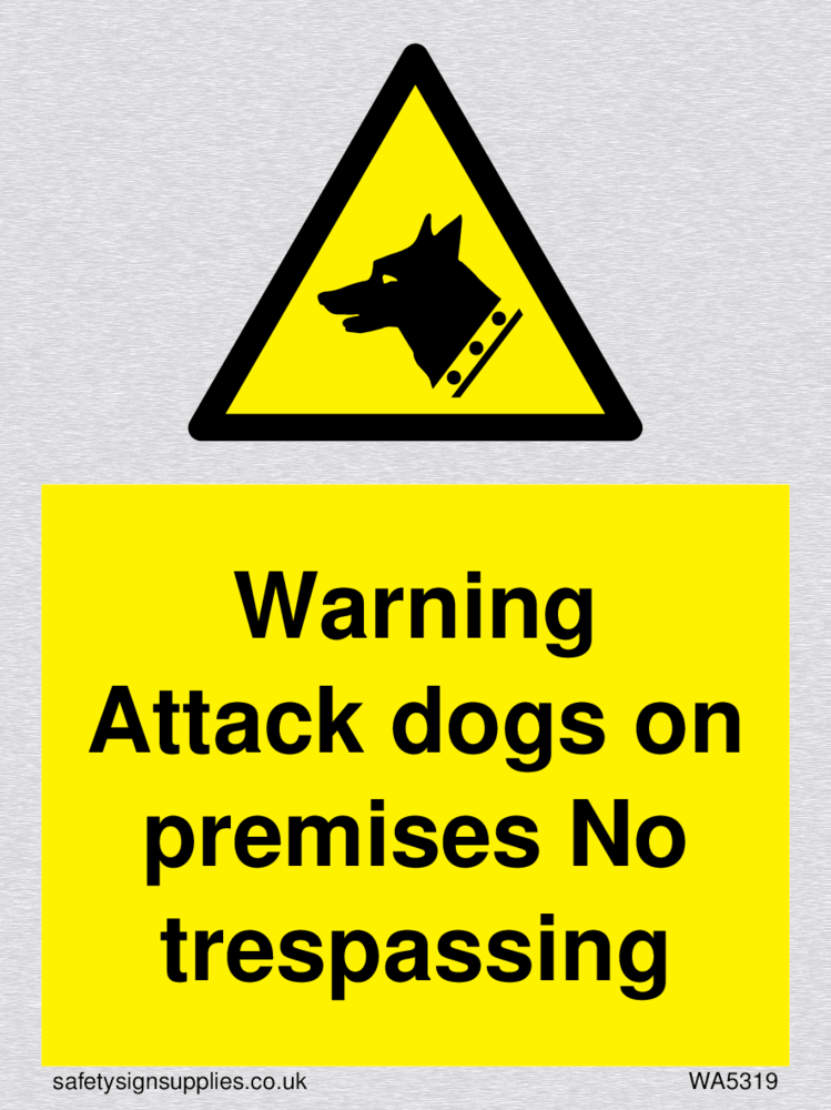 This sign contains a guard dog warning symbol. Guard dog in black on yellow warning triangle with black border.