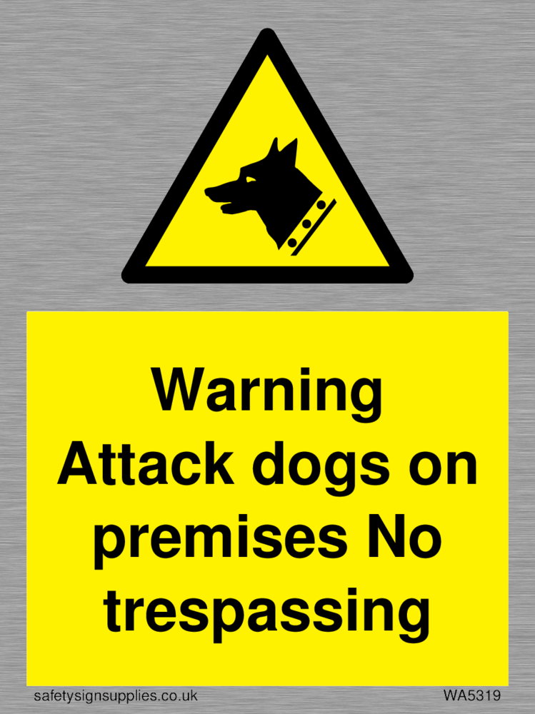 This sign contains a guard dog warning symbol. Guard dog in black on yellow warning triangle with black border.