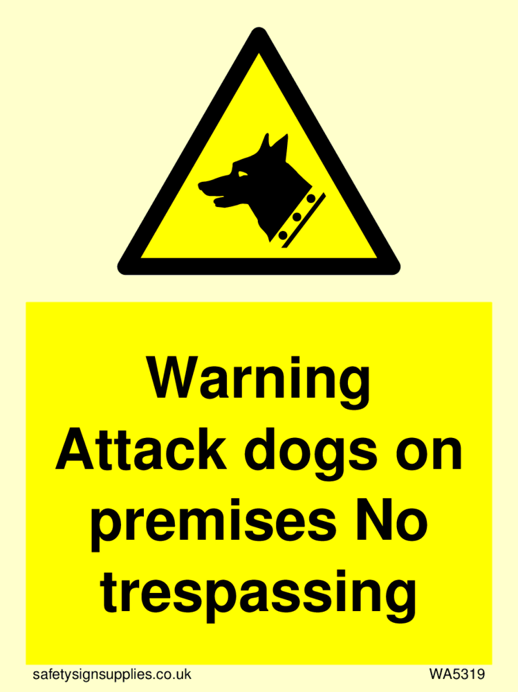 This sign contains a guard dog warning symbol. Guard dog in black on yellow warning triangle with black border.