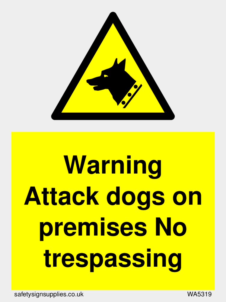 This sign contains a guard dog warning symbol. Guard dog in black on yellow warning triangle with black border.