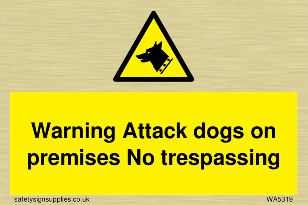 This sign contains a guard dog warning symbol. Guard dog in black on yellow warning triangle with black border.
