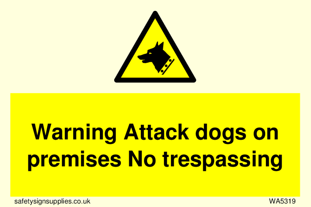 This sign contains a guard dog warning symbol. Guard dog in black on yellow warning triangle with black border.