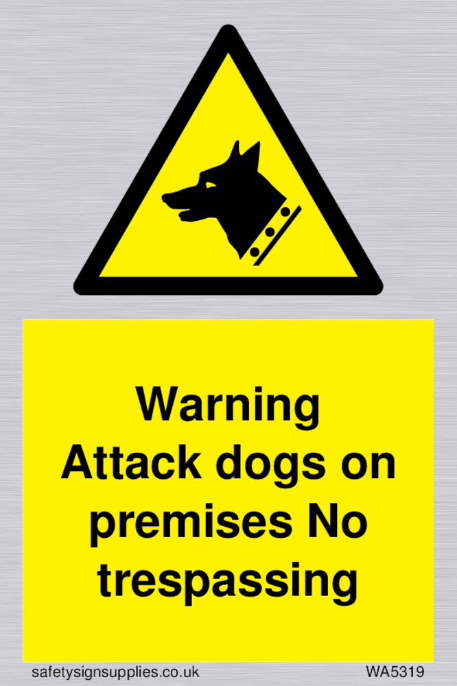 This sign contains a guard dog warning symbol. Guard dog in black on yellow warning triangle with black border.