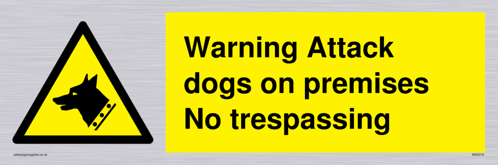 This sign contains a guard dog warning symbol. Guard dog in black on yellow warning triangle with black border.