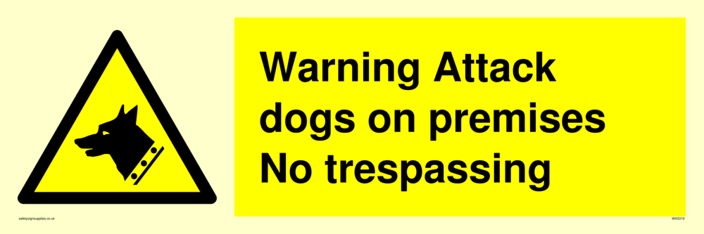 This sign contains a guard dog warning symbol. Guard dog in black on yellow warning triangle with black border.