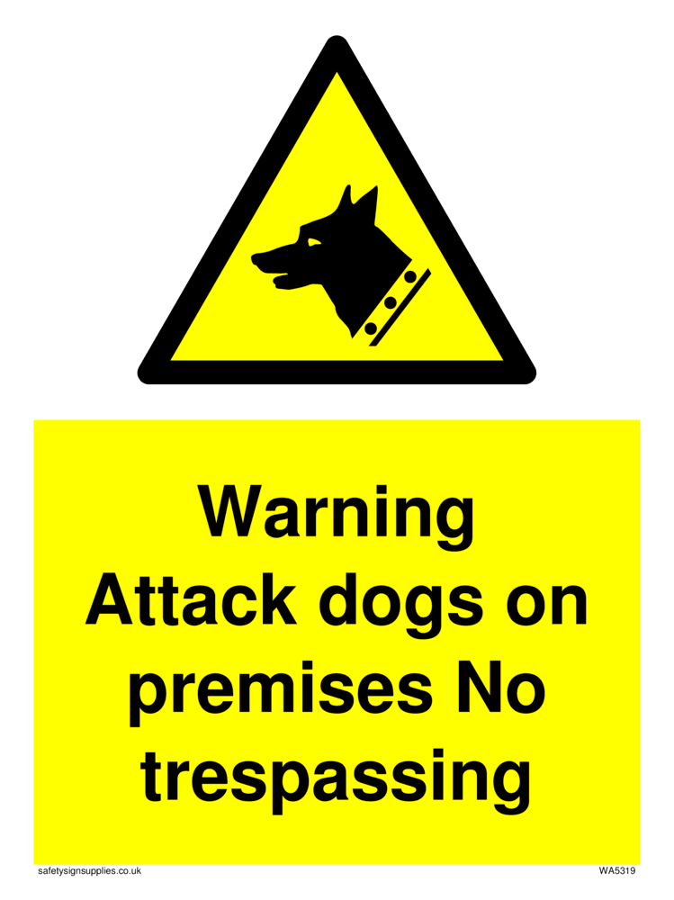 This sign contains a guard dog warning symbol. Guard dog in black on yellow warning triangle with black border.