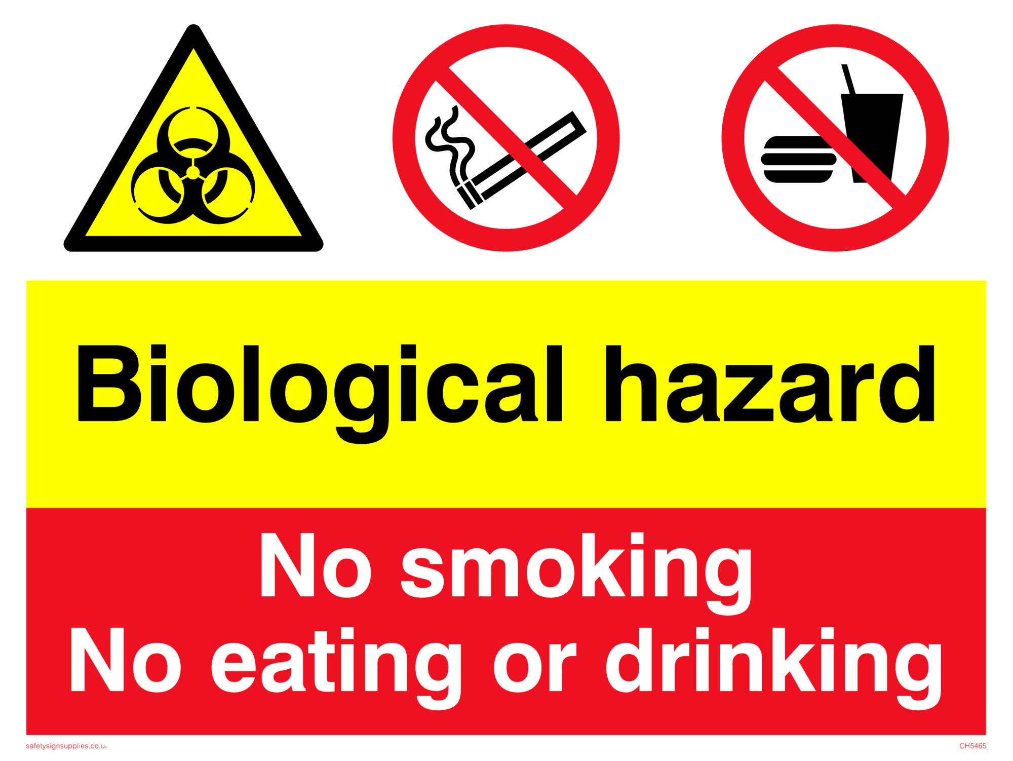 Smoking signs indicate when and where you can or cannot smoke. Chemical / Substance signs are used to indicate actions or health risks due to chemicals. A combination sign combines several safety sign types on one sign. This sign is large.