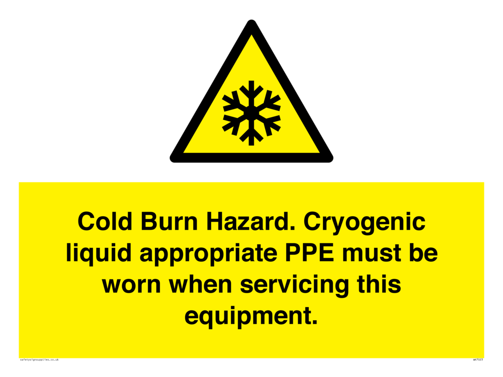 Sign Text: Cold Burn Hazard. Cryogenic liquid appropriate PPE must be worn when servicing this equipment.