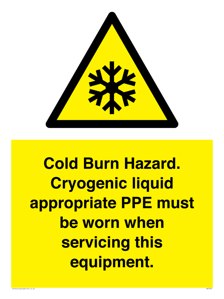 Sign Text: Cold Burn Hazard. Cryogenic liquid appropriate PPE must be worn when servicing this equipment.