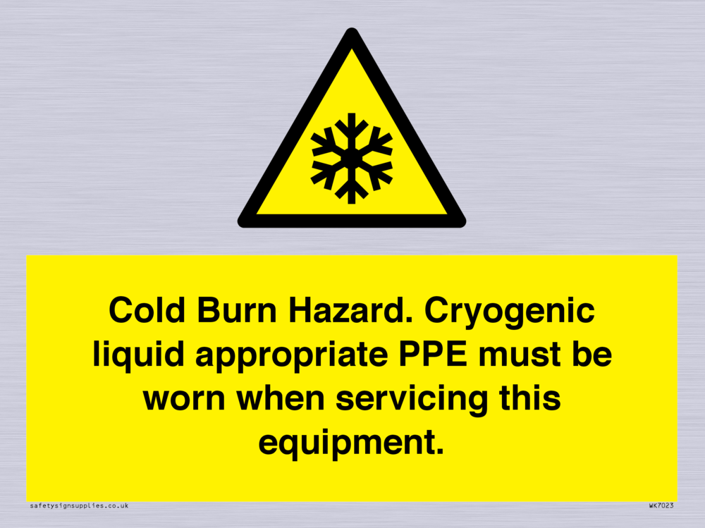 Sign Text: Cold Burn Hazard. Cryogenic liquid appropriate PPE must be worn when servicing this equipment.