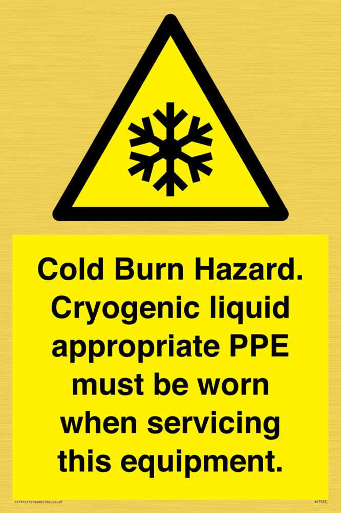 Sign Text: Cold Burn Hazard. Cryogenic liquid appropriate PPE must be worn when servicing this equipment.