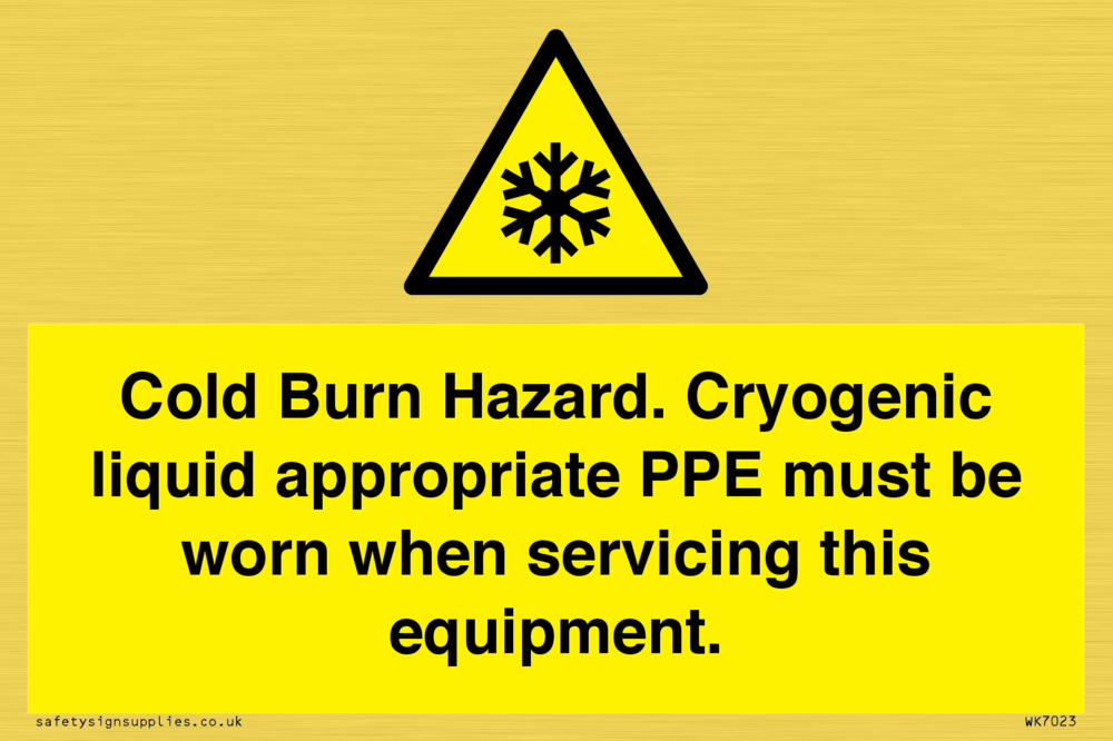 Sign Text: Cold Burn Hazard. Cryogenic liquid appropriate PPE must be worn when servicing this equipment.