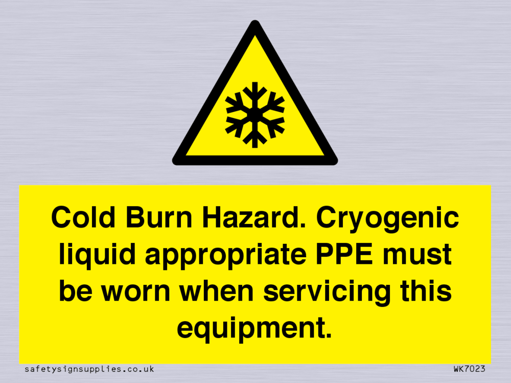 Sign Text: Cold Burn Hazard. Cryogenic liquid appropriate PPE must be worn when servicing this equipment.
