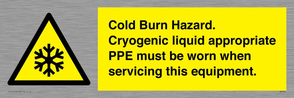 Sign Text: Cold Burn Hazard. Cryogenic liquid appropriate PPE must be worn when servicing this equipment.