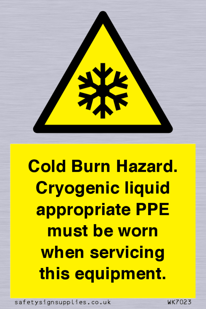Sign Text: Cold Burn Hazard. Cryogenic liquid appropriate PPE must be worn when servicing this equipment.