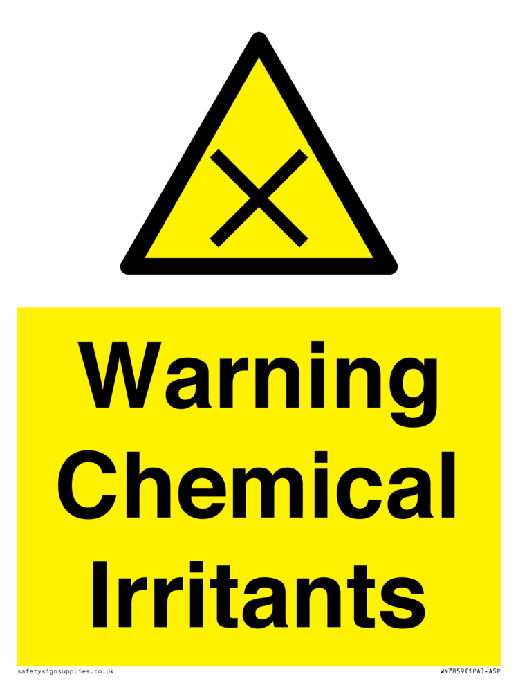 This sign contains an international standard irritant / harmful warning symbol. Diagonal black cross in yellow warning triangle with black border.